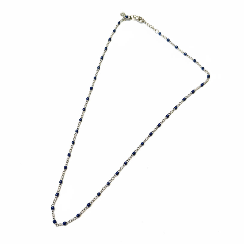 Très jolie chaîne en maille perlée bleu marine en acier inoxydable gris, habillera en toute discrétion votre décolleté.
