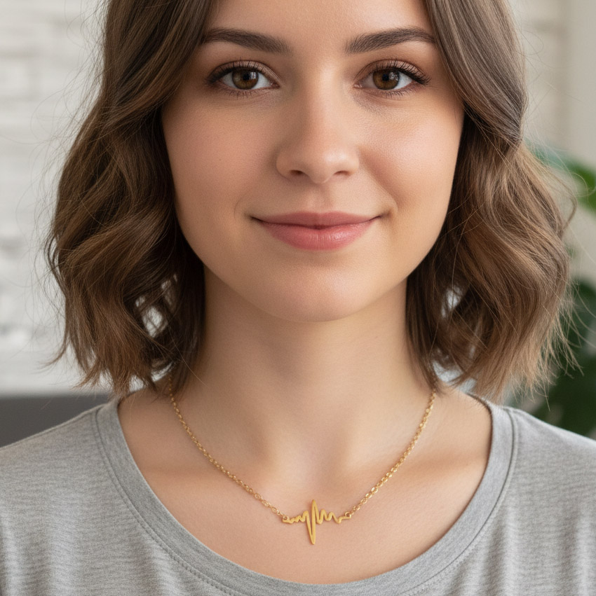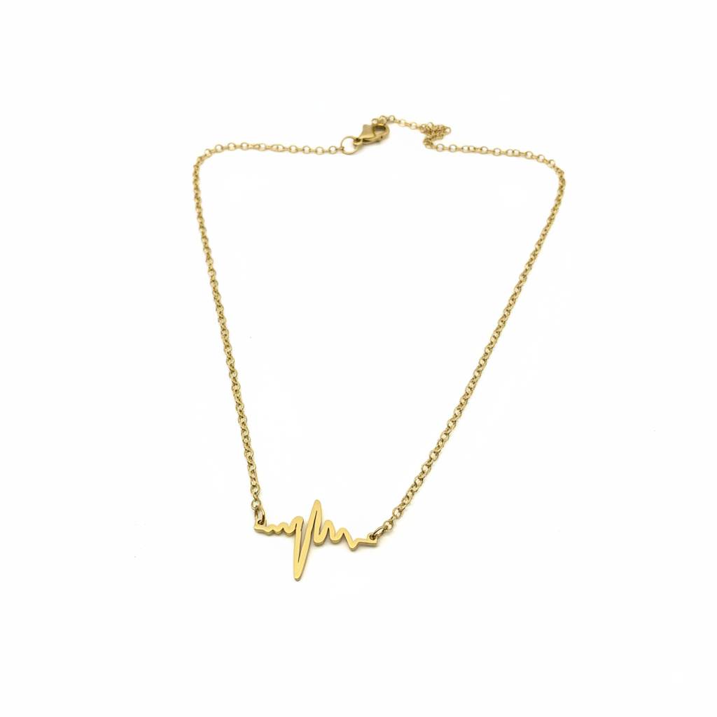 Très jolie collier avec sa maille ronde et son symbole d’Amour (pulsation cardiaque) en acier inoxydable doré.