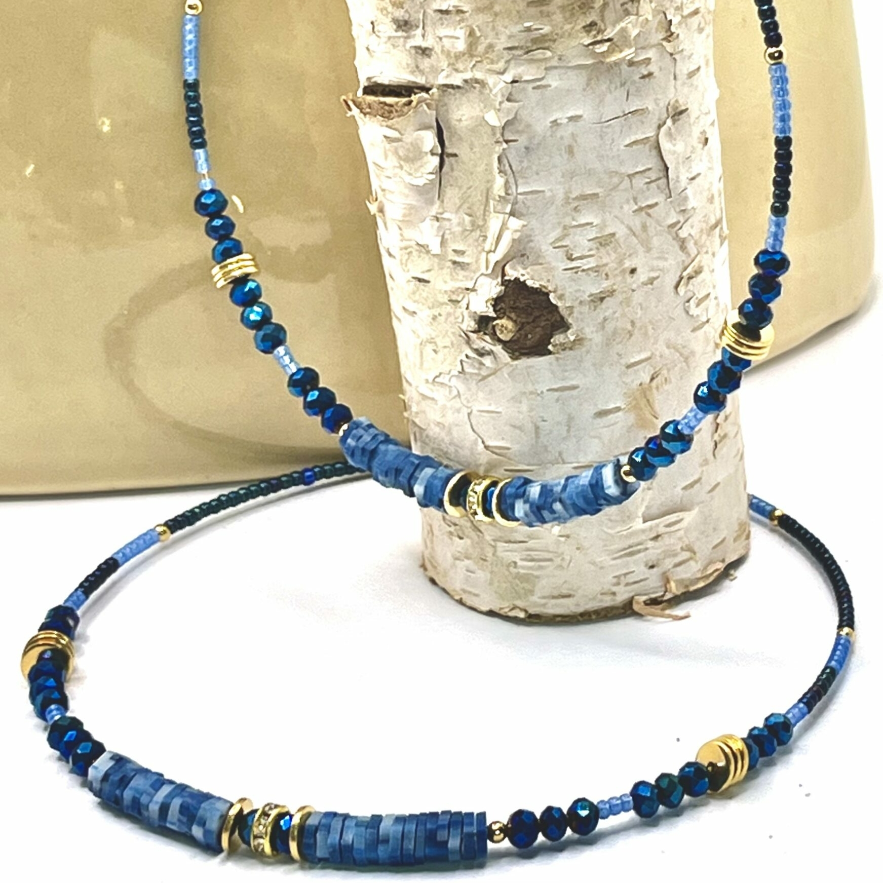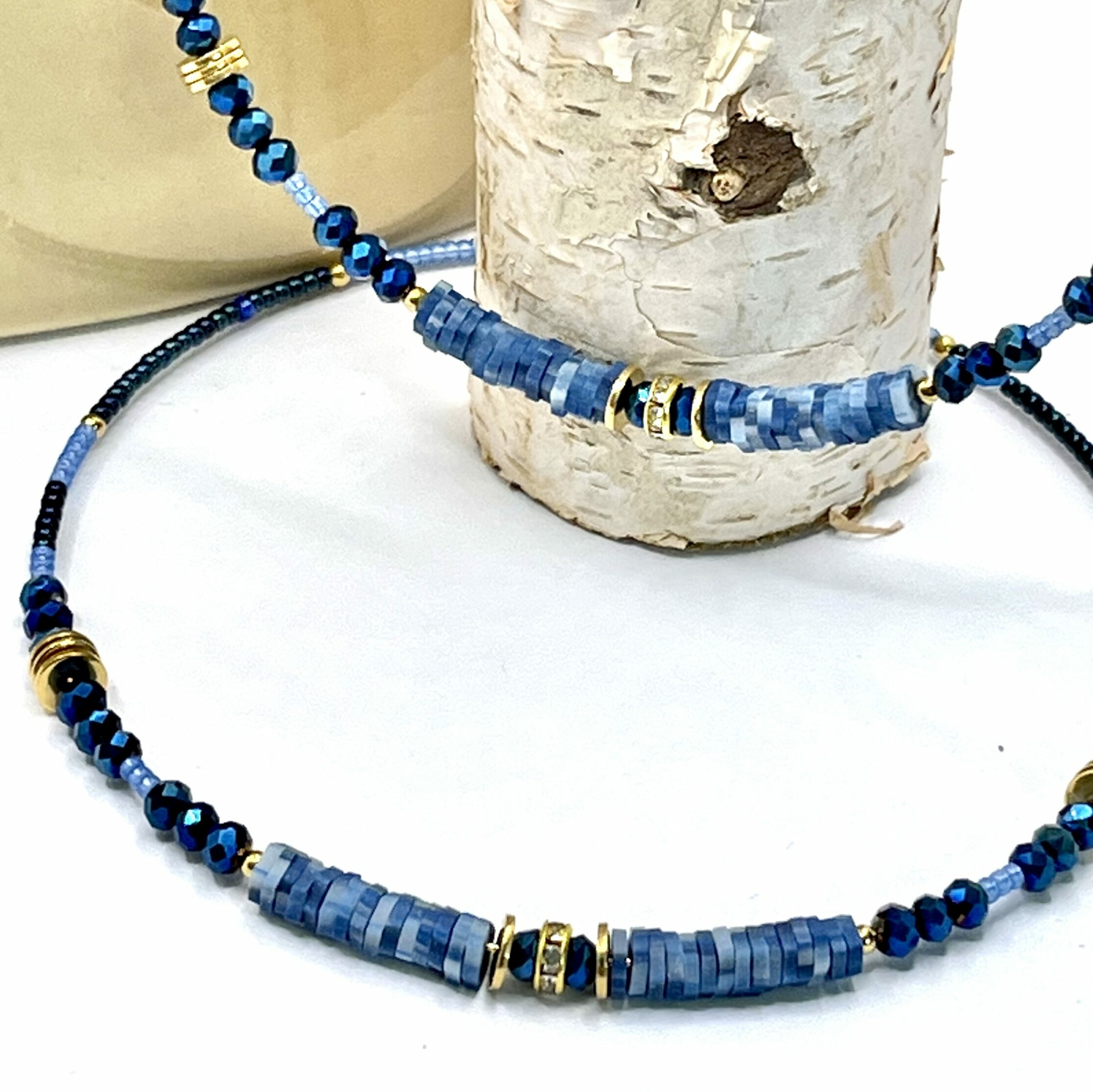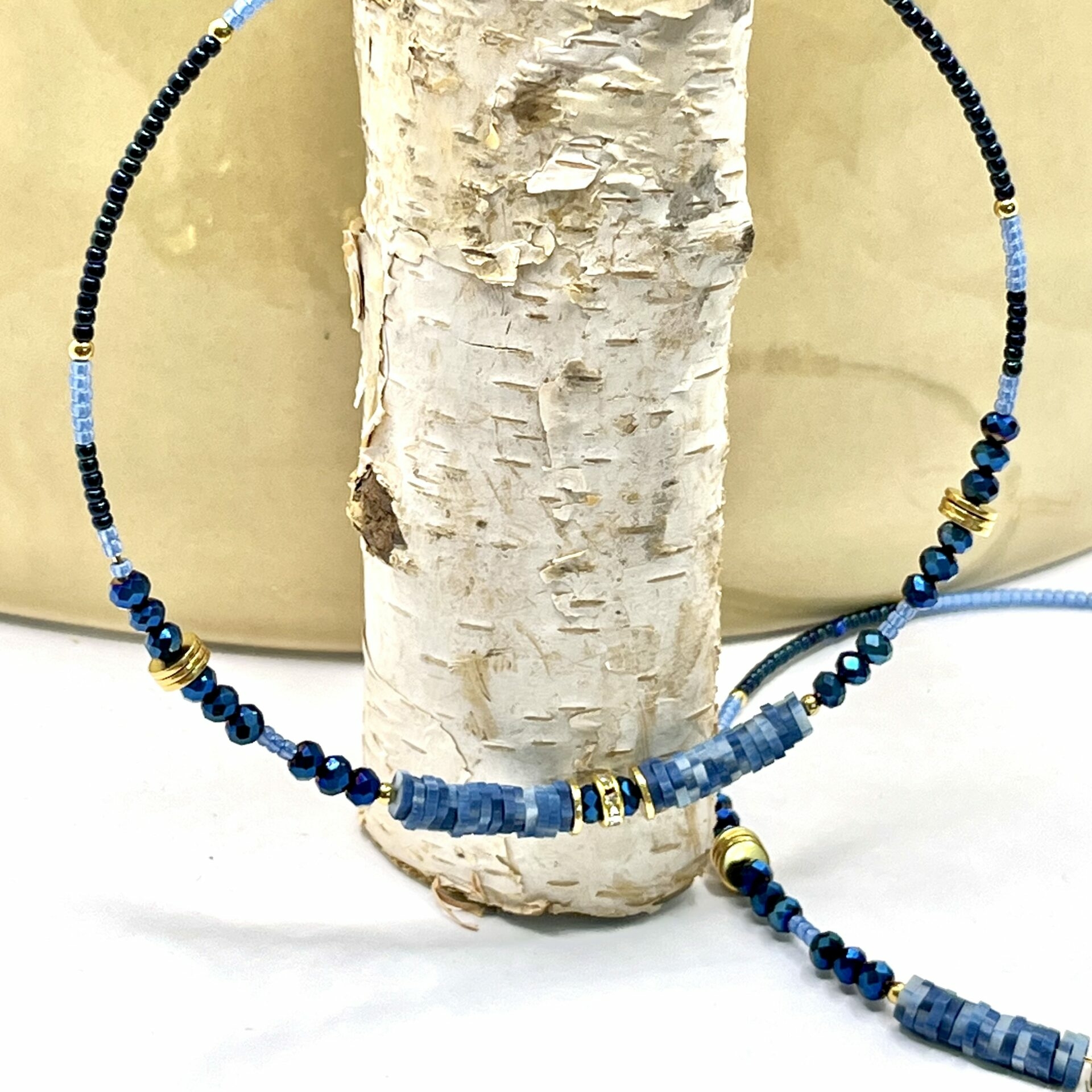 Très grande Créoles en acier inoxydable doré agrémentées d’un assortiment de perles et de matière différente le tout réalisé avec un joli dégradé de bleu.