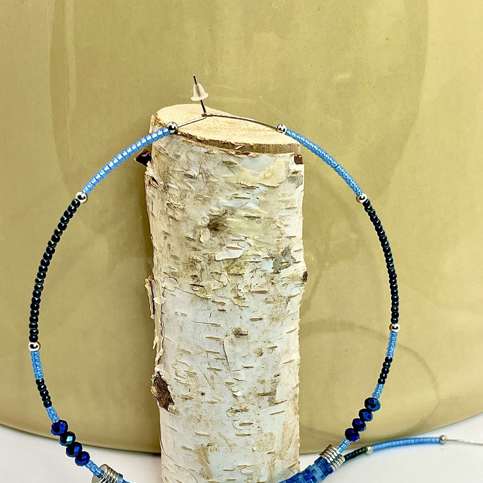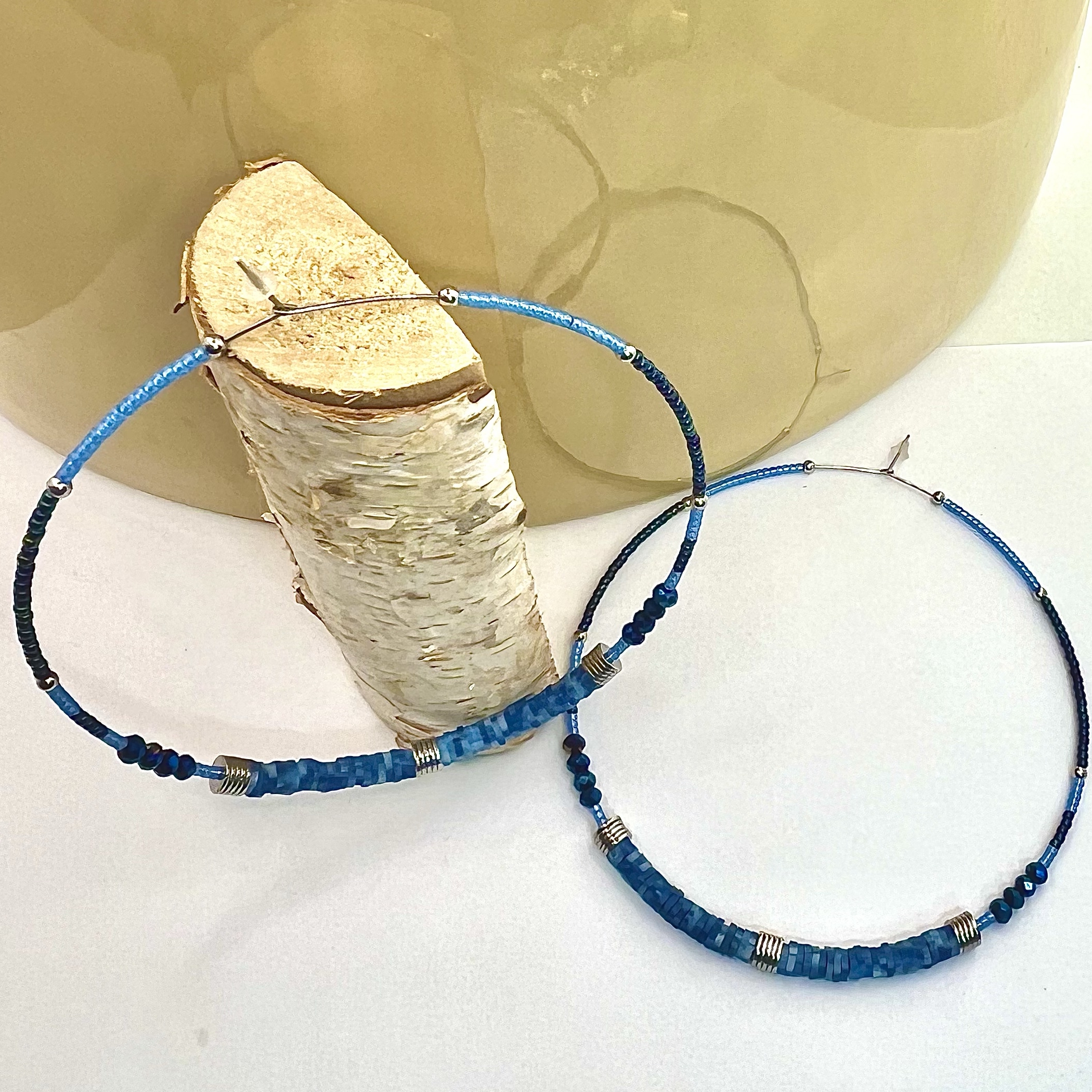 Très grande Créoles en acier inoxydable gris agrémentées d’un assortiment de perles et de matière différente le tout réalisé avec un joli dégradé de bleu.